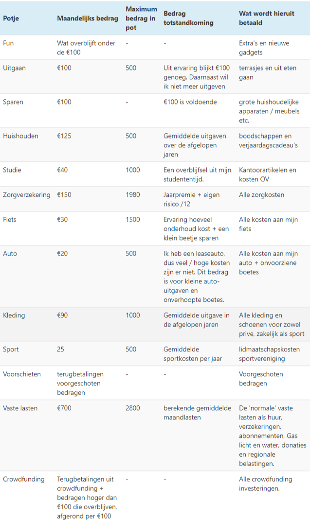 In onderstaande tabel staat de verdeling voor mijn potjes van afgelopen jaar.