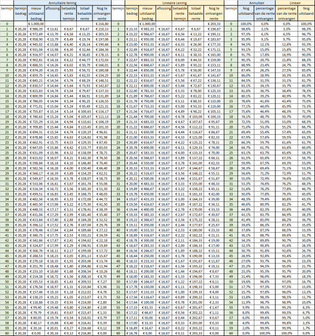 Ik heb het hieronder eens uitgewerkt. Een 5 jarige lening waar je €1000 in investeert en daar 8% rente over krijgt. In het rechter deel zie je de aflossingen bij een annutaire lening. Bij een lineaire aflossing (de rechter berekening) zie je dat elke maand hetzelfde wordt afgelost en over het nog uitstaande bedrag wordt rente betaald. En inderdaad: in het begin van de lening wordt het meeste aan rente betaald. Na zo’n 20 termijnen heb je al de helft van het te ontvangen rentebedrag ontvangen. Maar, dan is het uitstaande bedrag ook al enorm gezakt. Als laatste heb ik ook het vergelijk gemaakt hoeveel procent van de te ontvangen rente je nou al hebt ontvangen en hoeveel procent van de lening nog uitstaat (helemaal rechts). Wat blijkt: bij een lineaire aflossing heb je altijd al een groter deel van de te ontvangen rente ontvangen, onafhankelijk in werk termijn je zit. Wel ontvang je in euro’s wat minder rente. (klik vooral op de afbeelding om hem vergroot te kunnen zien)