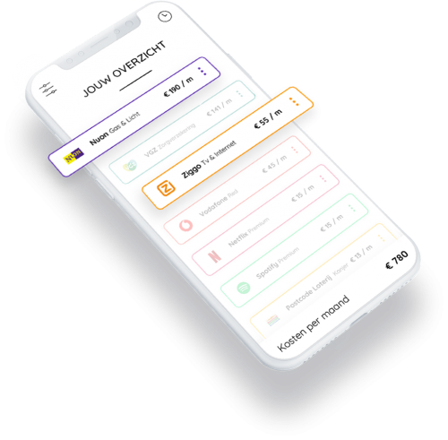 Zodra Dyme klaar is met het verwerken van al jouw afschrijvingen, krijg je een keurig overzicht te zien wat jij maandelijks standaard kwijt bent. Hypotheek/huur, energie, water, internet, telefoon. Je ziet ze allemaal terug in het rijtje. Klopt het niet, bijvoorbeeld omdat de frequentie anders is of omdat er een uitgave mist, kan je alles zelf nog aanpassen of toevoegen.