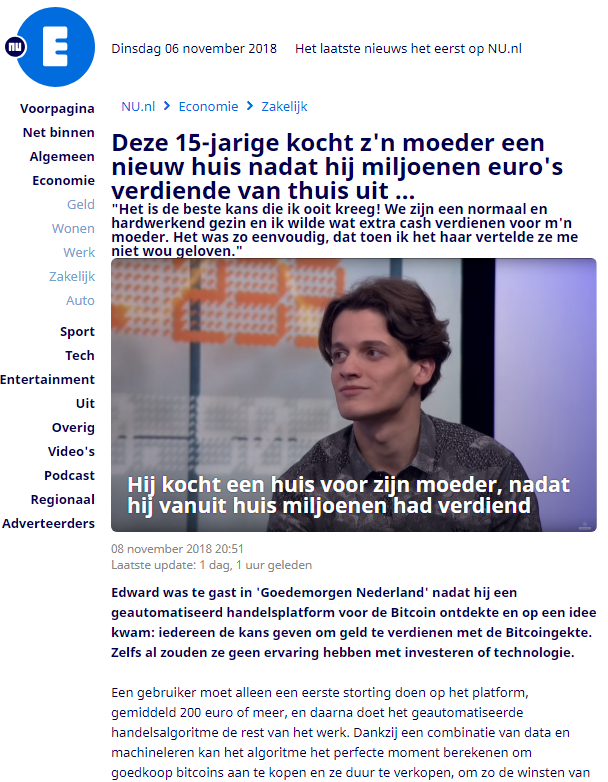 Wat een geinig artikel. Een jongen (Edward) die veel had verdiend met Bitcoins en daarmee z’n moeder een huis cadeau deed. Bijna schattig. Hij was achter een website gekomen die met een slim algoritme Bitcoins perfect kan verhandelen. Omdat hij in een interview van Goedemorgen Nederland verscheen, werd dit direct ook in de studio even uitgeprobeerd. €200 storten en laat maar lopen. Binnen de 10 minuten had de presentatrice al bijna €400. Dat is makkelijk verdienen!